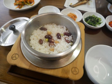 각종 곡물들과 뽀얀 쌀밥이 솥에 담겨 나왔는데,
