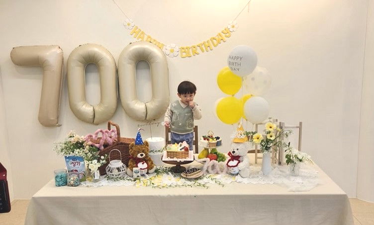 짜잔! 너무 예쁘죠? 기본 상차림에 700일 대형 숫자 파티까지 주니스튜디오에서 준비해 주셔서, 우리가 먹을 케이크와 아이 간식만 조금 챙겨갔더니 파티 상차림이 정말 화려하게 되었어요.